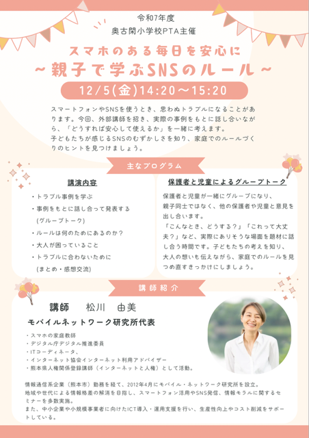 令和7年度奥古閑小学校SNS講演会「スマホのある毎日を安心に~親子で学ぶSNSのルール~」 2025.12.052025.12.07 2025年12月5日(金) 14:20〜15:20熊本市立奥古閑小学校PTA様主催奥古閑小学校体育館にて開催参加者 約200名(全校生徒122名・保護者) 講演演題「スマホのある毎日を安心に~親子で学ぶSNSのルール~」・トラブル事例をもとにグループトーク・利用ルールは何のため?・保護者の皆様へ