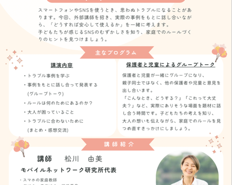 2025年12月5日(金) 14:20〜15:20熊本市立奥古閑小学校PTA様主催奥古閑小学校体育館にて開催参加者 約200名(全校生徒122名・保護者)講演演題「スマホのある毎日を安心に~親子で学ぶSNSのルール~」・トラブル事例をもとに...